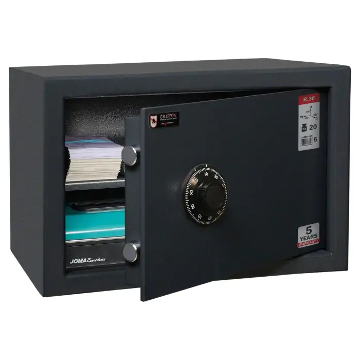 Griffon R.30.C це сейф меблевий, для дому, за допомогою якого можна захистити документи А4 у квартирі, будинку чи офісі. Конструкція корпусу 2 мм (сталь), дверей 5 мм (сталь), ригельна система одностороння, 2 ригелі Ø 25 мм та замок - кодовий механічний La GARD (США) VdS Class 1 (A) забезпечують базовий рівень захисту. Сейф вміщає документи А4. Передбачена можливість анкерування до підлоги чи стіни.