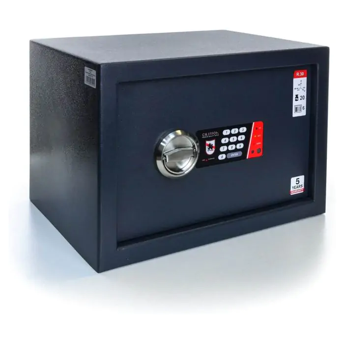Griffon R.30.E це сейф меблевий, для дому, за допомогою якого можна захистити документи А4 у квартирі, будинку чи офісі. Конструкція корпусу 2 мм (сталь), дверей 5 мм (сталь), ригельна система одностороння, 2 ригелі Ø 25 мм та замок - електронний Griffon 2.0 (Україна) забезпечують базовий рівень захисту. Сейф вміщає документи А4. Передбачена можливість анкерування до підлоги чи стіни.