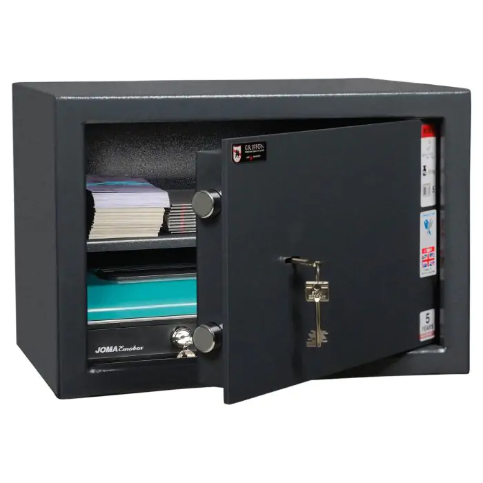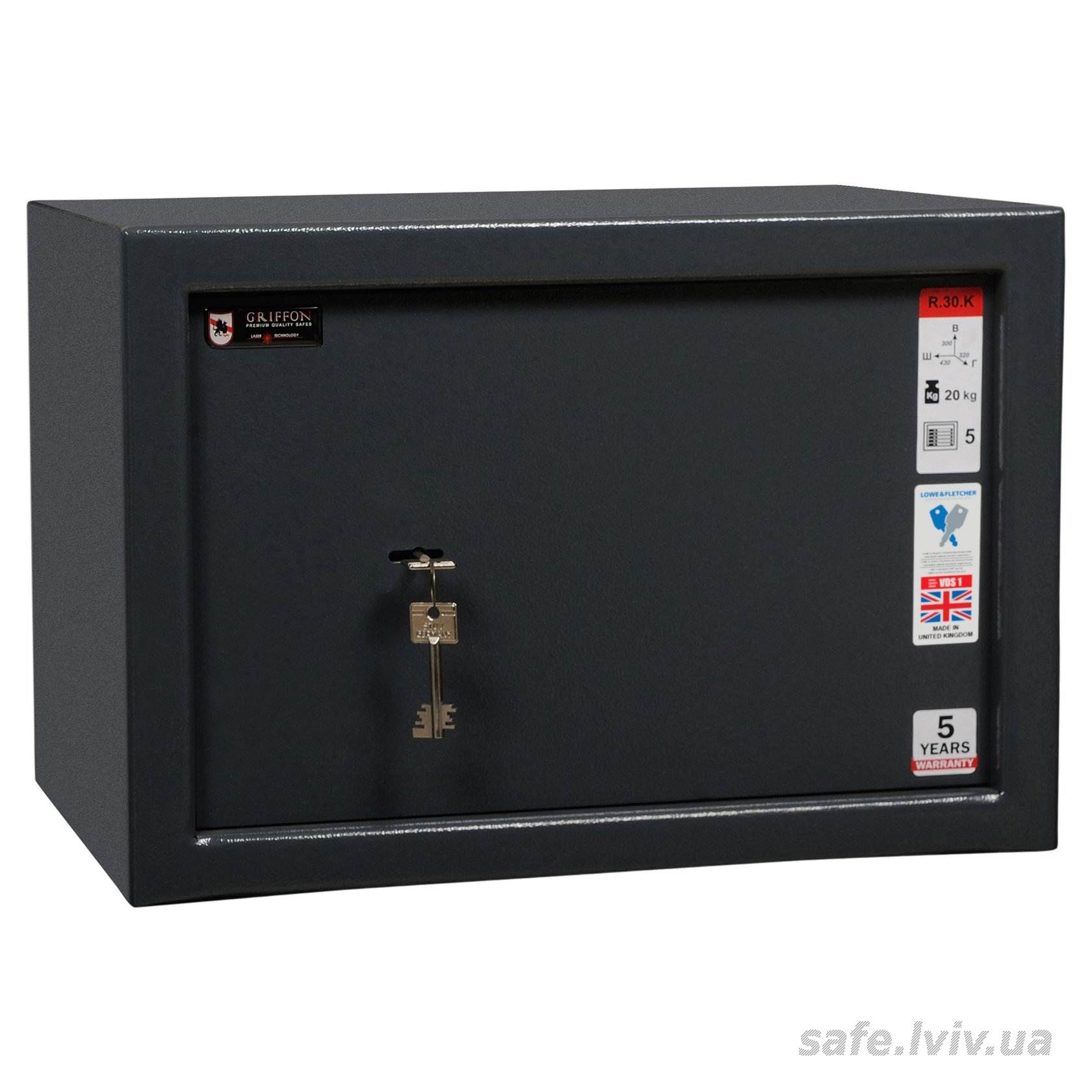 Griffon R.30.K це сейф меблевий, для дому, за допомогою якого можна захистити документи А4 у квартирі, будинку чи офісі. Конструкція корпусу 2 мм (сталь), дверей 5 мм (сталь), ригельна система одностороння, 2 ригелі Ø 25 мм та замок - ключовий STUV (Німеччина) VdS Class 1 (A) забезпечують базовий рівень захисту. Сейф вміщає документи А4. Передбачена можливість анкерування до підлоги чи стіни.