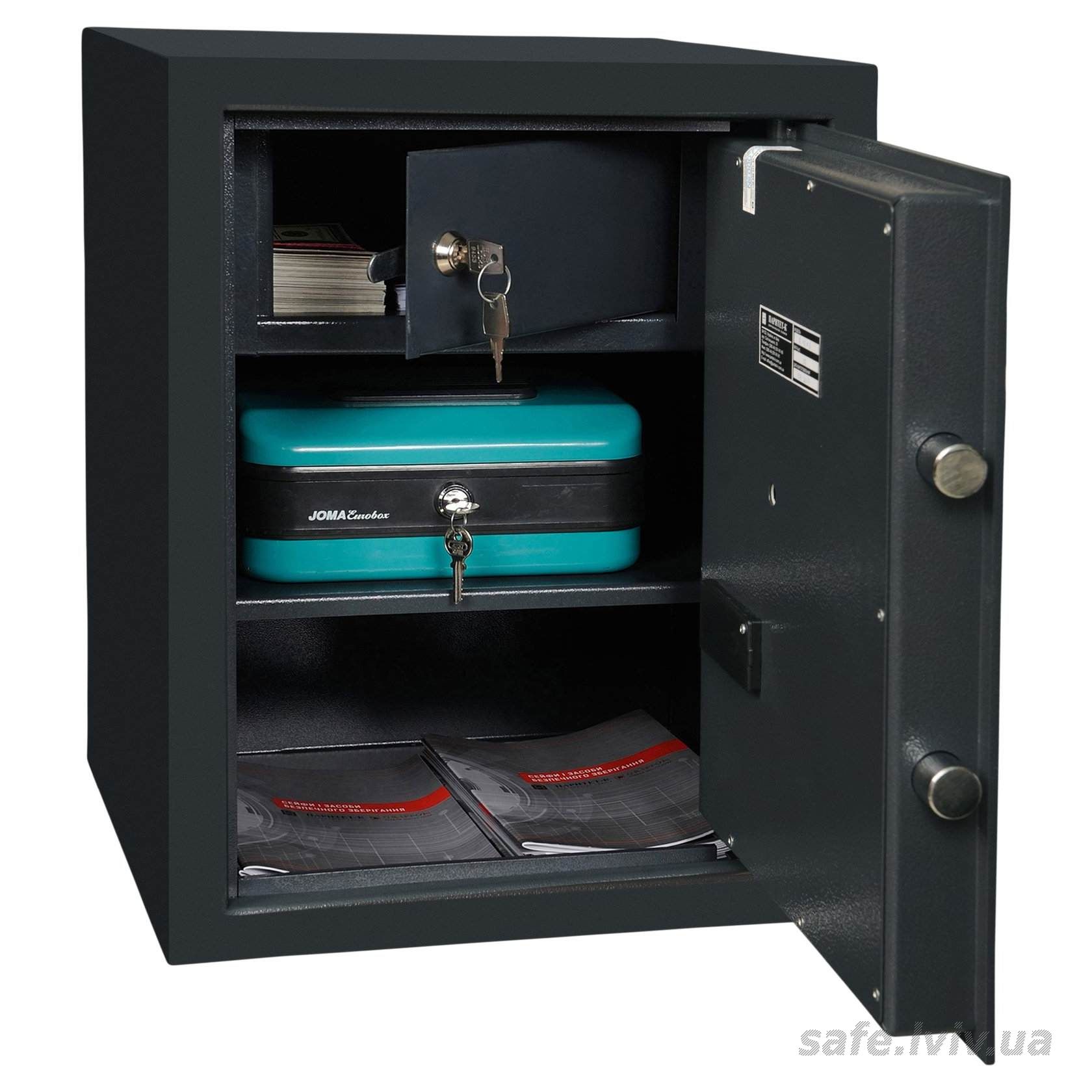 - Конструкція: корпус 2 мм (сталь), двері 5 мм (сталь); ригельна система одностороння, 2 ригелі Ø 25 мм.