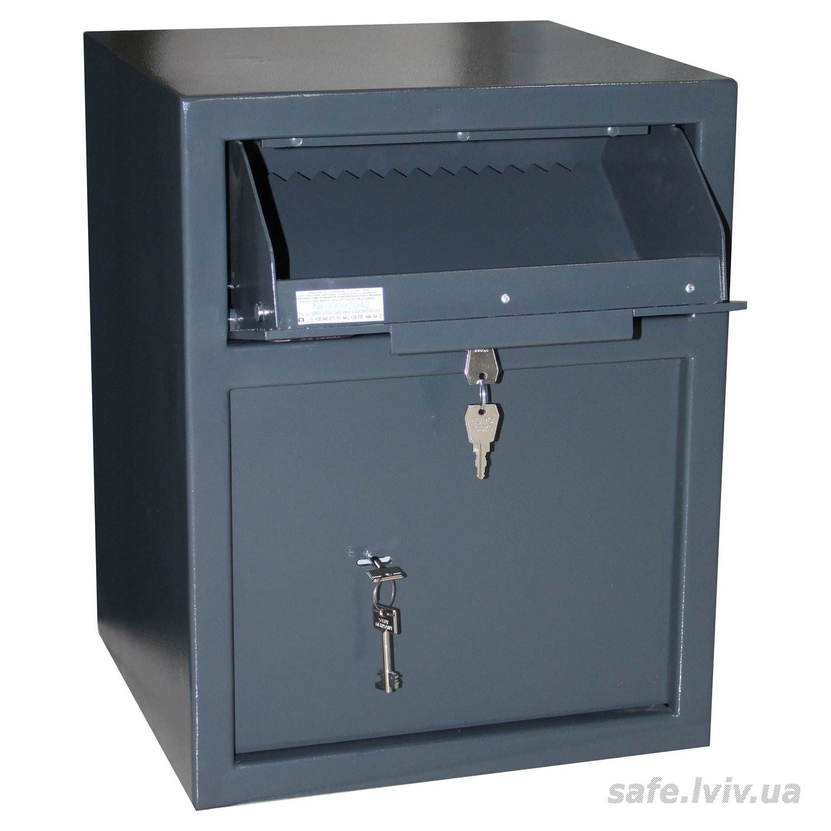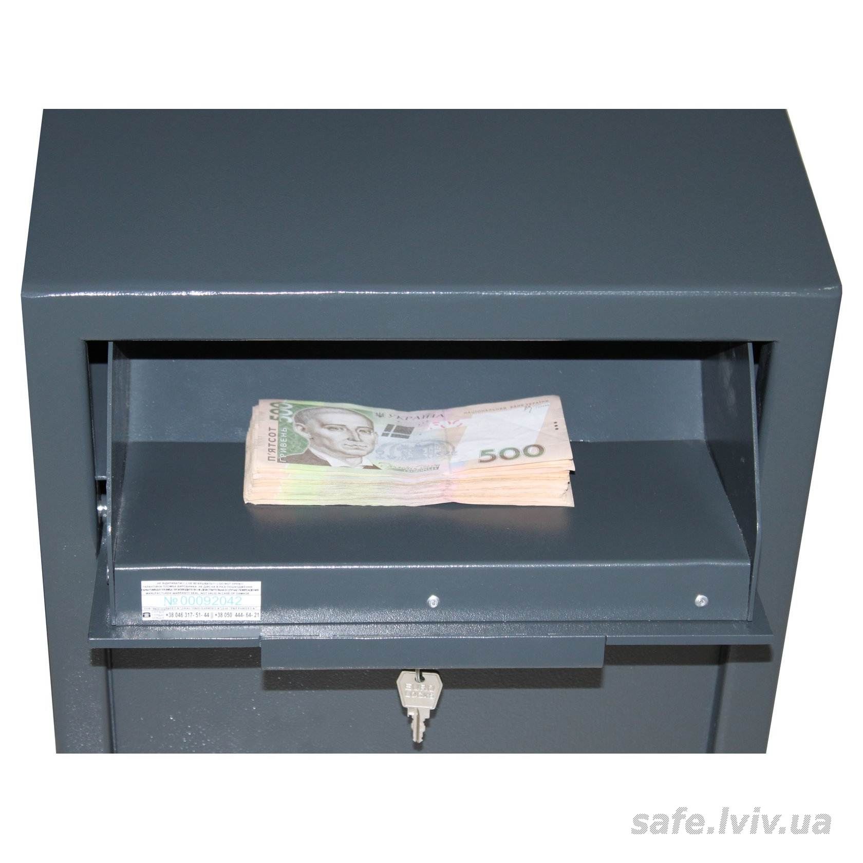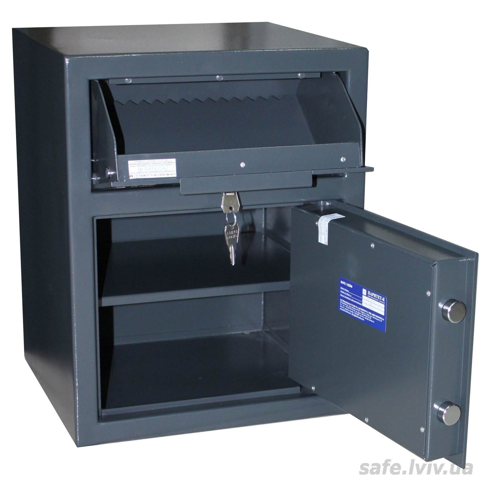 - Конструкція: корпус 2 мм (сталь), двері 5 мм (сталь); ригельна система одностороння, 2 ригелі Ø 25 мм.