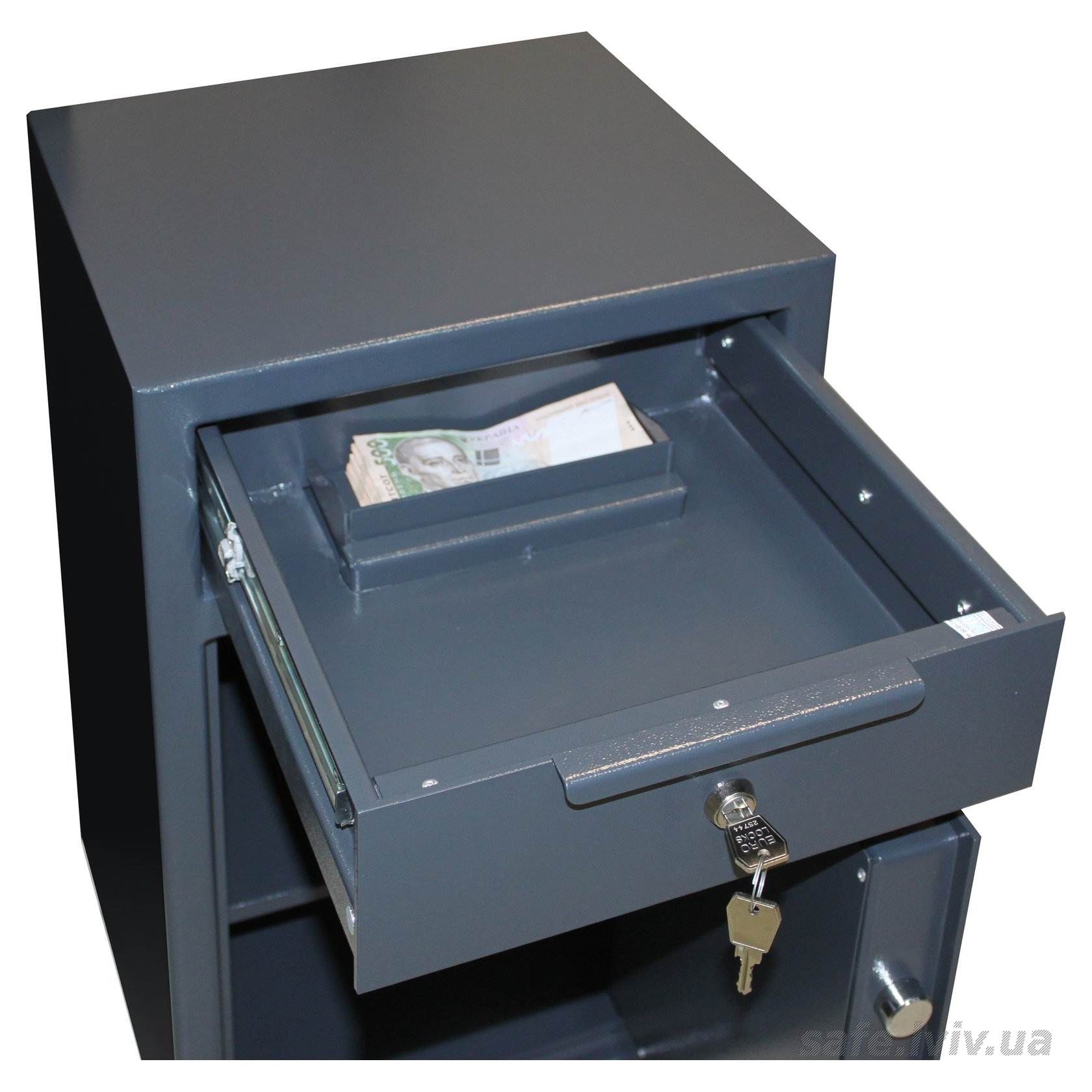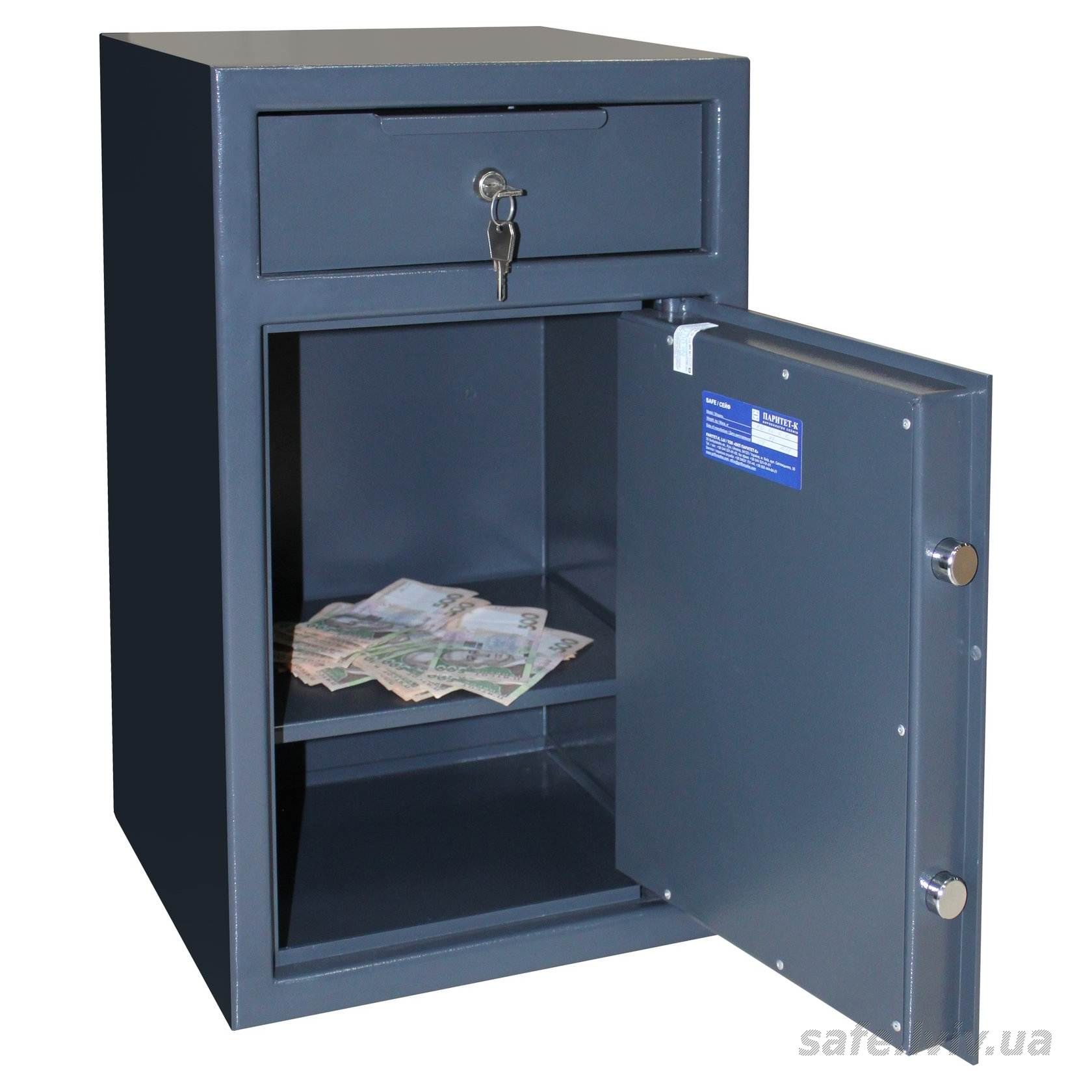 - Конструкція: корпус 2 мм (сталь), двері 5 мм (сталь); ригельна система одностороння, 2 ригелі Ø 25 мм.