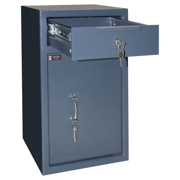 Griffon RD.60.K.K це депозитний сейф Griffon, створений на базі серії R з додатковим вузлом для депонування готівки. Призначений для безпечного зберігання грошей і цінностей у магазинах, на АЗС, у банках, ресторанах та інших установах з великим оборотом готівки. Зламостійкість забезпечує конструкція корпусу 2 мм (сталь), дверей 5 мм (сталь), ригельна система одностороння, 2 ригелі Ø 25 мм та замок 2 ключових STUV (Німеччина) VdS Class 1 (A). Депонування здійснюється через спеціальний вузол без доступу до основного відділення.