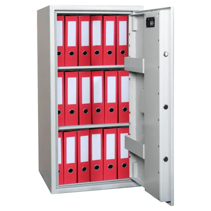 Griffon SS.105.K це сертифікований офісний сейф для документів, призначений для надійного зберігання документів у папках-сегрегаторах, готівки і цінностей в офісі. Зламостійкість забезпечує конструкція корпусу , дверей та ригельна система . Замок - ключовий WITTKOPP (Німеччина) VDS 2 (B). Комплектація - .