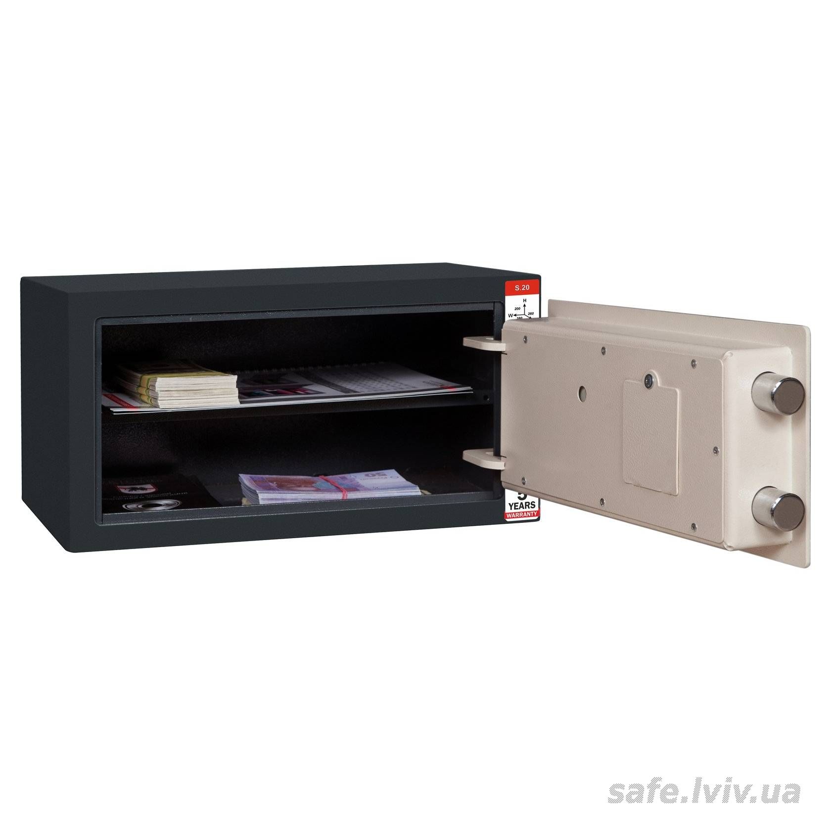 Griffon S.20.E це сейф меблевий, для дому, призначений для надійного зберігання таких цінностей, як документи А4 у квартирі чи установі. Конструкція корпусу 3 мм (сталь), дверей 3 мм (сталь), ригельна система одностороння, 2 ригелі Ø 25 мм. Доступні виконання замка - електронний Griffon 2.0 (Україна).