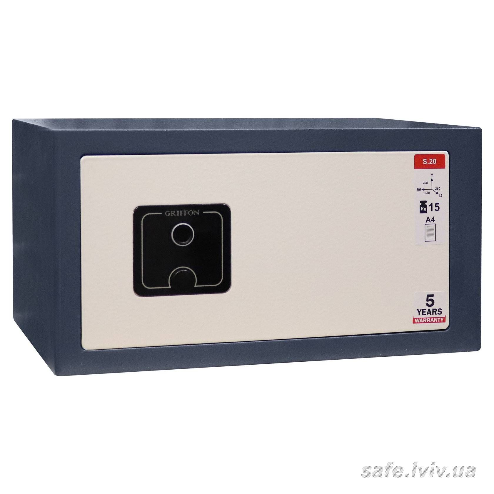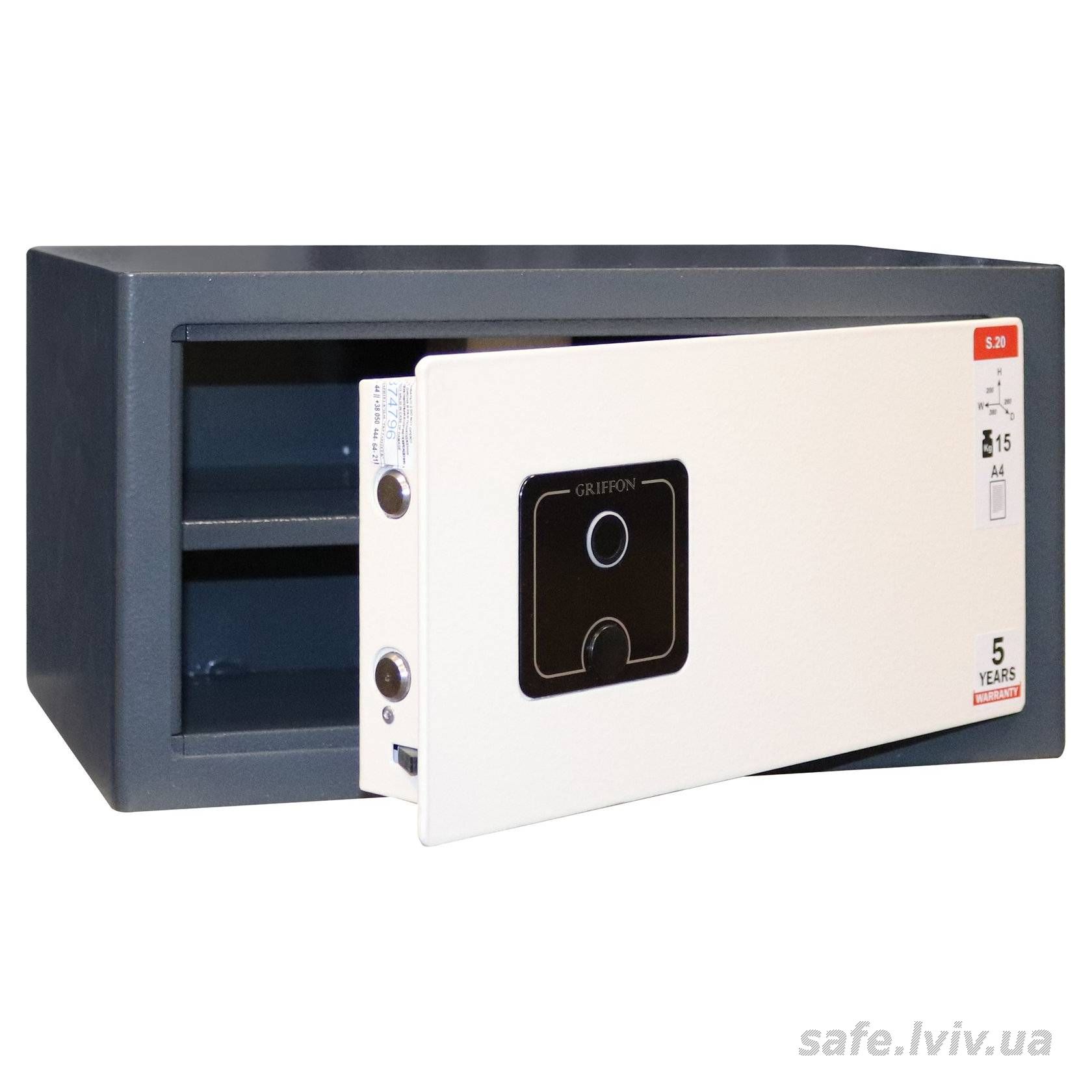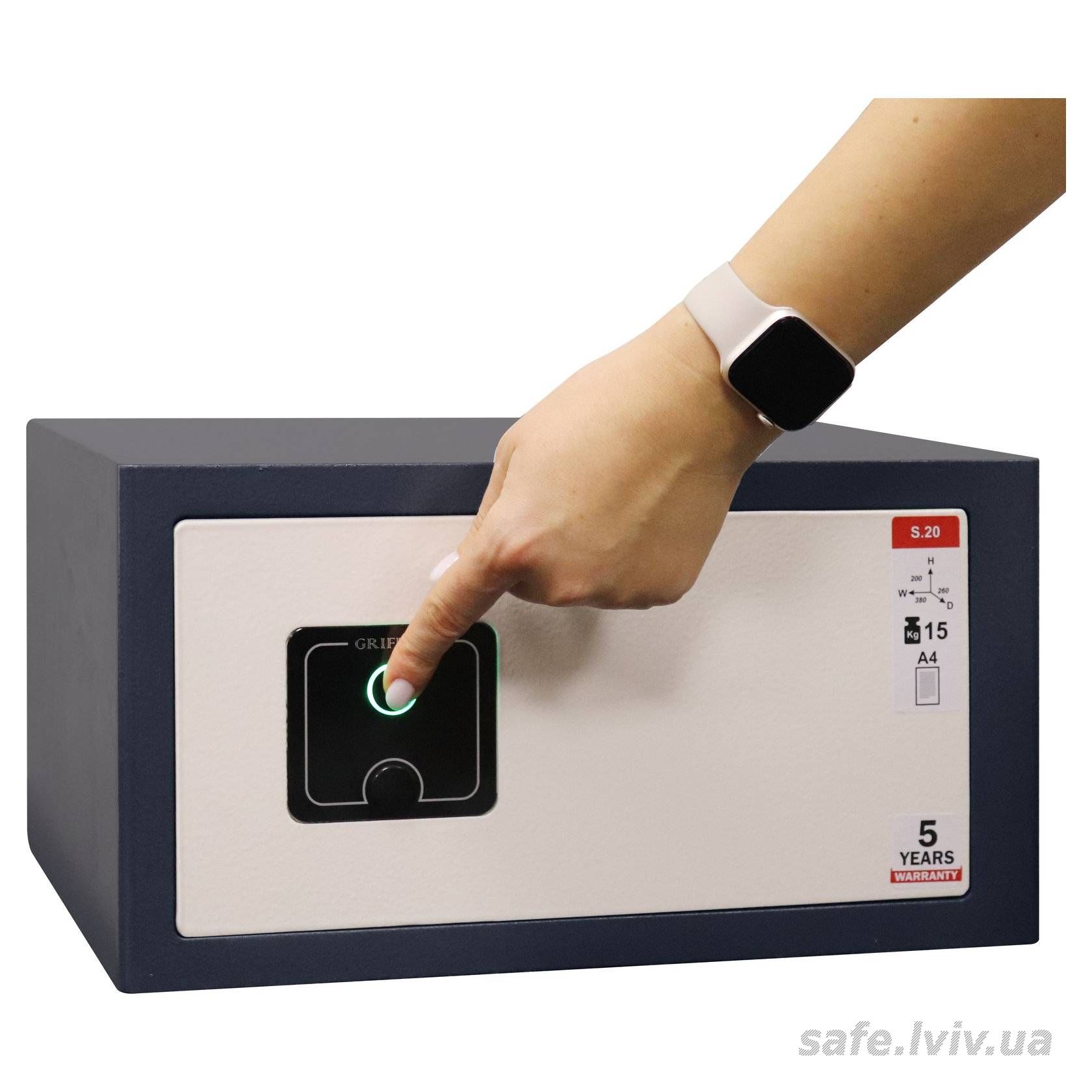 Griffon S.20.Fingerprint це сейф меблевий, для дому, призначений для надійного зберігання таких цінностей, як документи А4 у квартирі чи установі. Конструкція корпусу 3 мм (сталь), дверей 3 мм (сталь), ригельна система одностороння, 2 ригелі Ø 25 мм. Доступні виконання замка - біометричний GRIFFON.FP.LIGHT.
