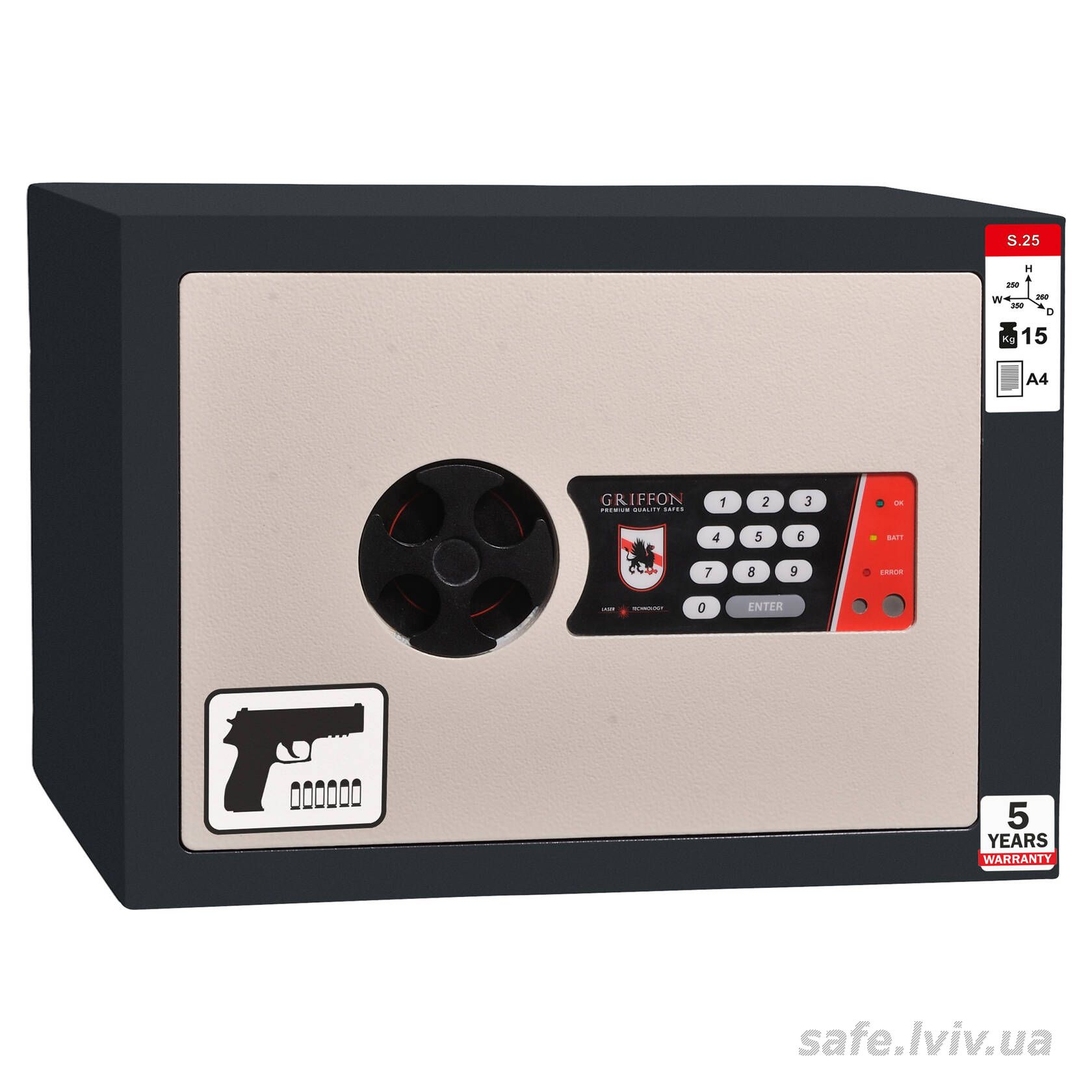 Griffon S.25.E.P це сейф пістолетний, призначений для надійного зберігання таких цінностей, як 2 пістолети, документи А4 у квартирі чи установі. Конструкція корпусу 3 мм (сталь), дверей 3 мм (сталь), ригельна система одностороння, 2 ригелі Ø 25 мм. Доступні виконання замка - електронний Griffon 2.0 (Україна).
