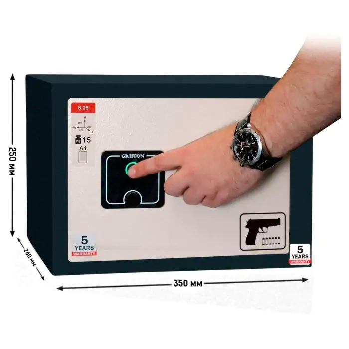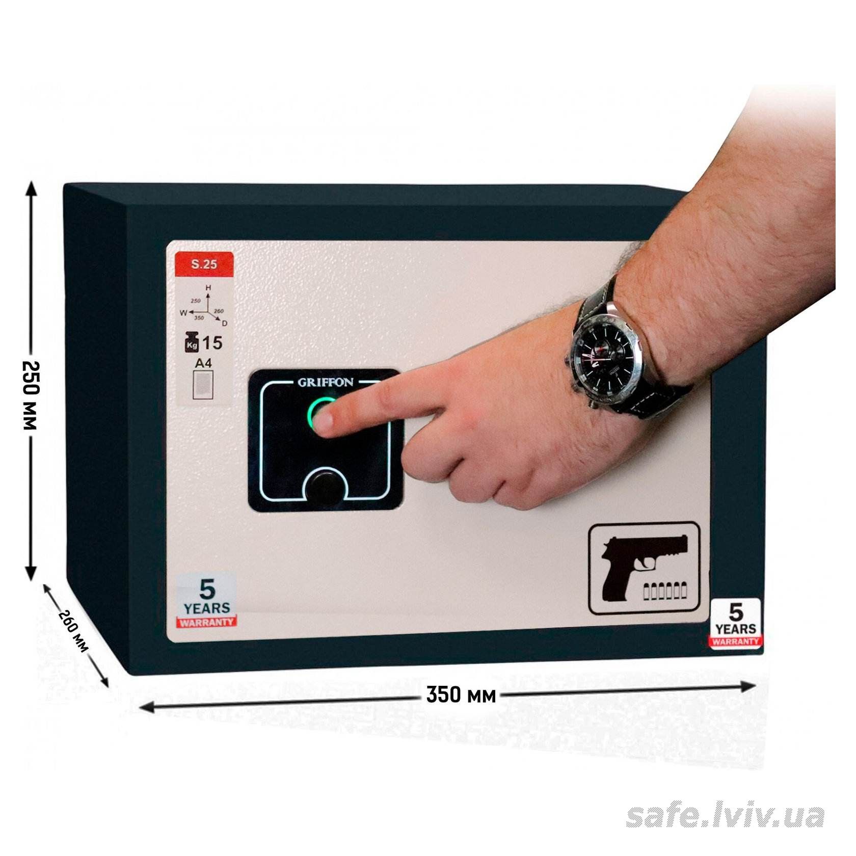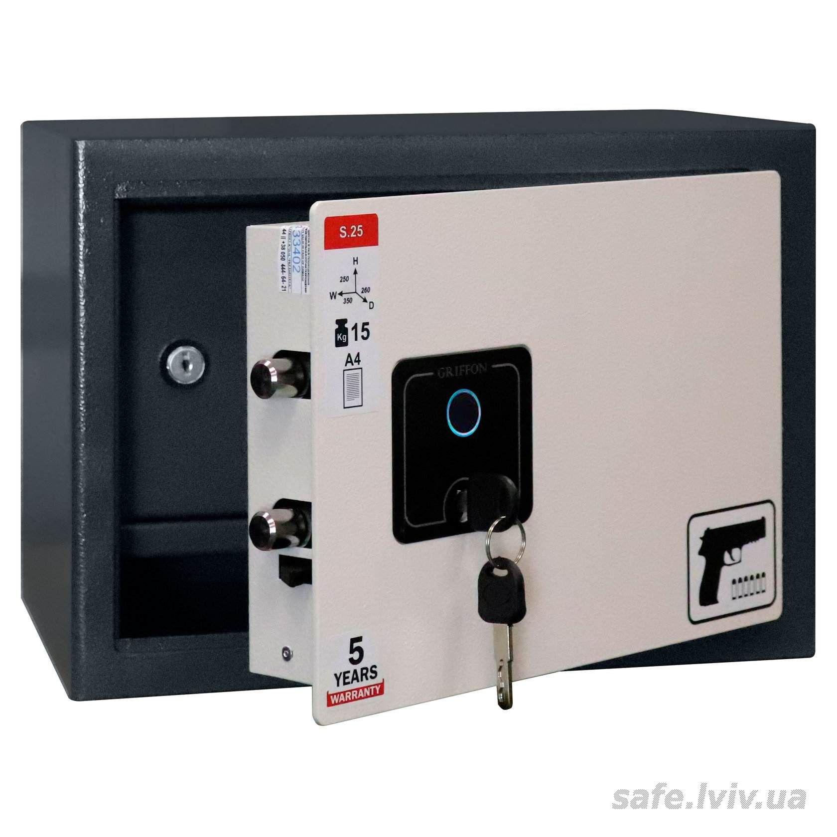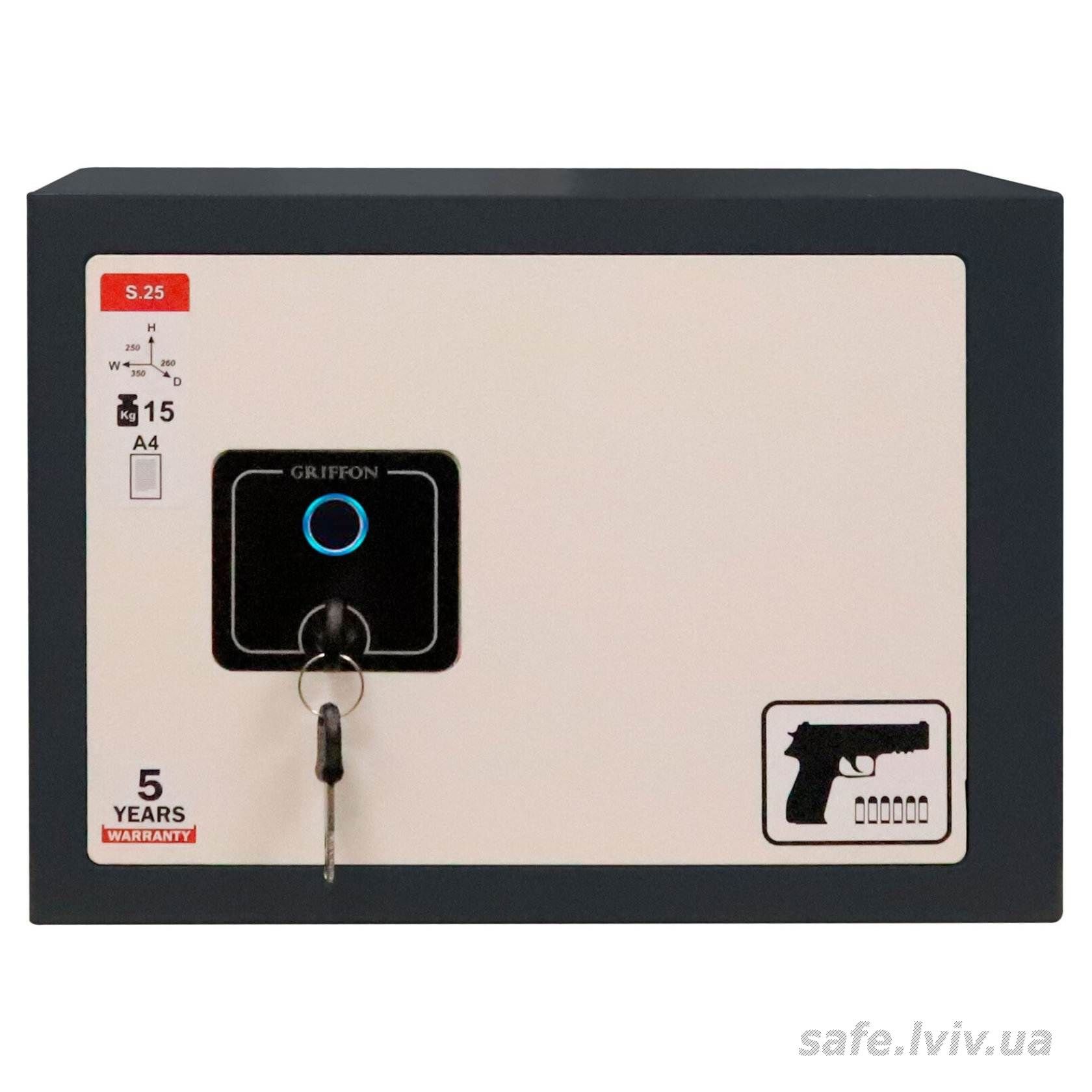 Griffon S.25.FP.P це сейф пістолетний, призначений для надійного зберігання таких цінностей, як 2 пістолети, документи А4 у квартирі чи установі. Конструкція корпусу 3 мм (сталь), дверей 3 мм (сталь), ригельна система одностороння, 2 ригелі Ø 25 мм. Доступні виконання замка - біометричний GRIFFON.FP.LIGHT.