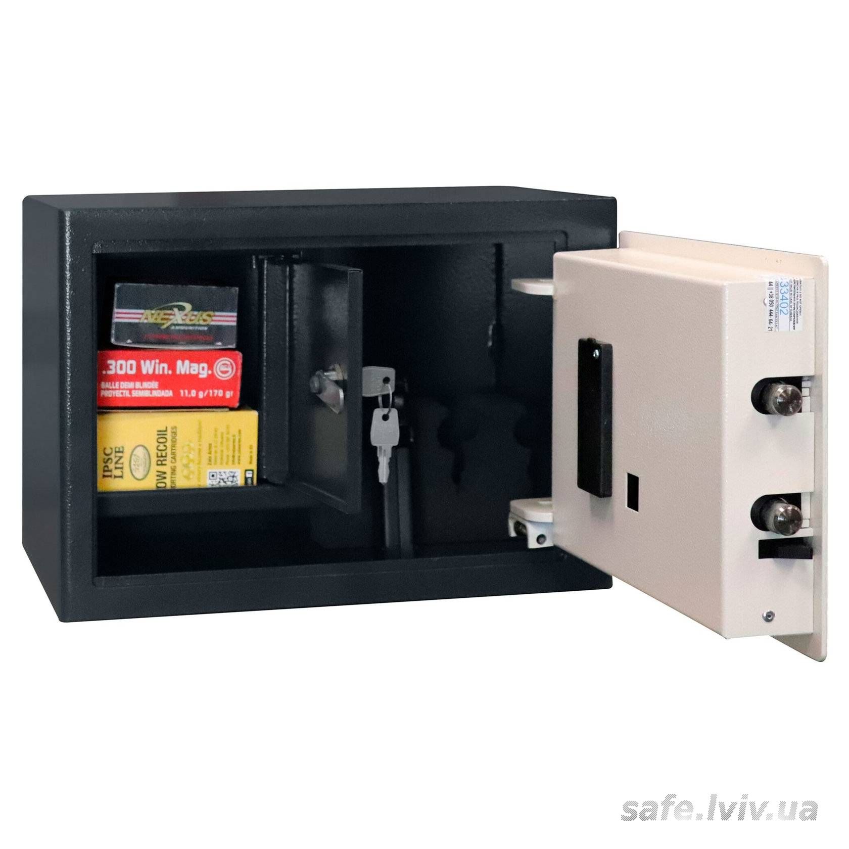 - Конструкція: корпус 3 мм (сталь), двері 3 мм (сталь); ригельна система одностороння, 2 ригелі Ø 25 мм.