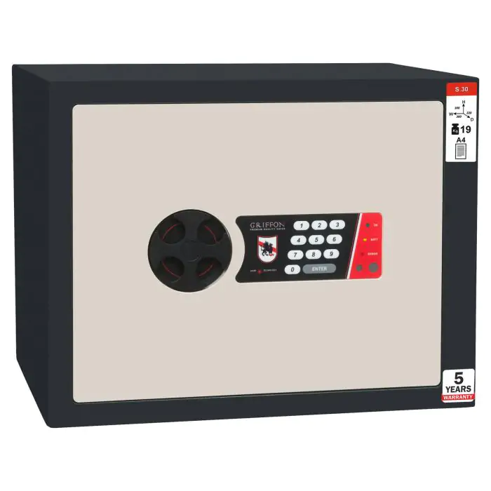 Griffon S.30.E це сейф меблевий, для дому, призначений для надійного зберігання таких цінностей, як документи А4 у квартирі чи установі. Конструкція корпусу 3 мм (сталь), дверей 3 мм (сталь), ригельна система одностороння, 2 ригелі Ø 25 мм. Доступні виконання замка - електронний Griffon 2.0 (Україна).