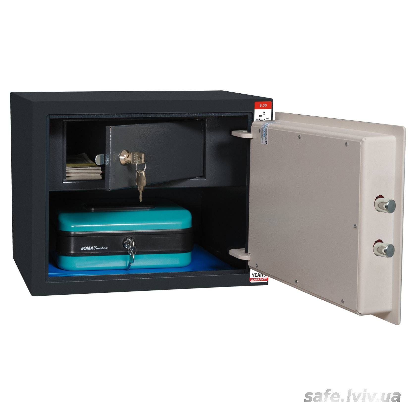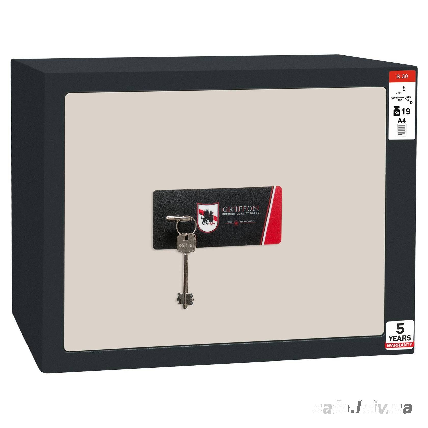 Griffon S.30.K.T це сейф меблевий, для дому, призначений для надійного зберігання таких цінностей, як документи А4 у квартирі чи установі. Конструкція корпусу 3 мм (сталь), дверей 3 мм (сталь), ригельна система одностороння, 2 ригелі Ø 16 мм. Доступні виконання замка - ключовий SK 106/4 (Україна).