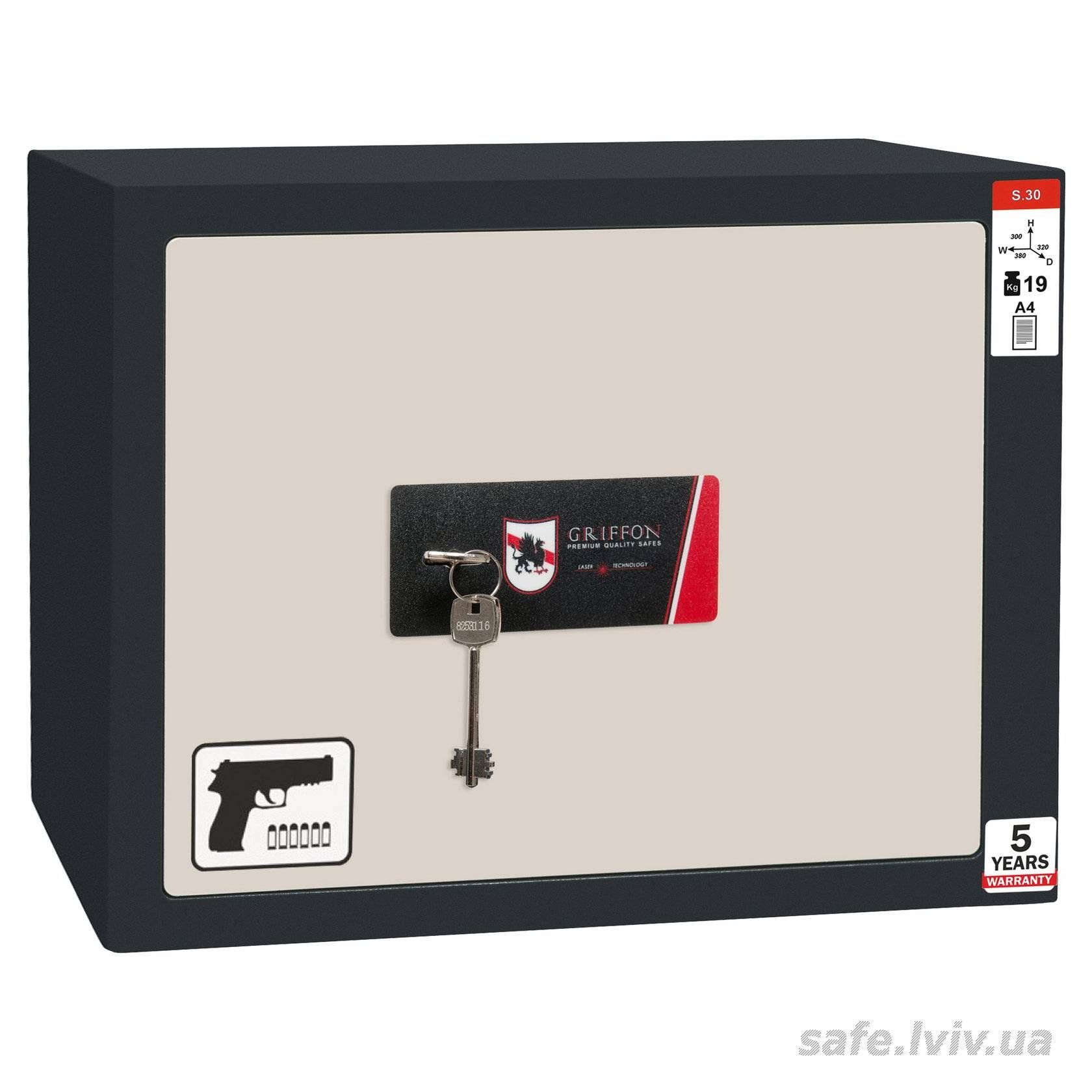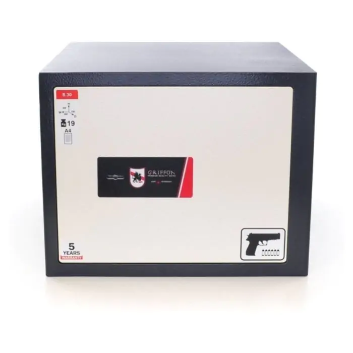 Griffon S.30.K.T.P це сейф пістолетний, призначений для надійного зберігання таких цінностей, як 2 пістолети, документи А4 у квартирі чи установі. Конструкція корпусу 3 мм (сталь), дверей 3 мм (сталь), ригельна система . Доступні виконання замка - ключовий SK 106/4 (Україна).