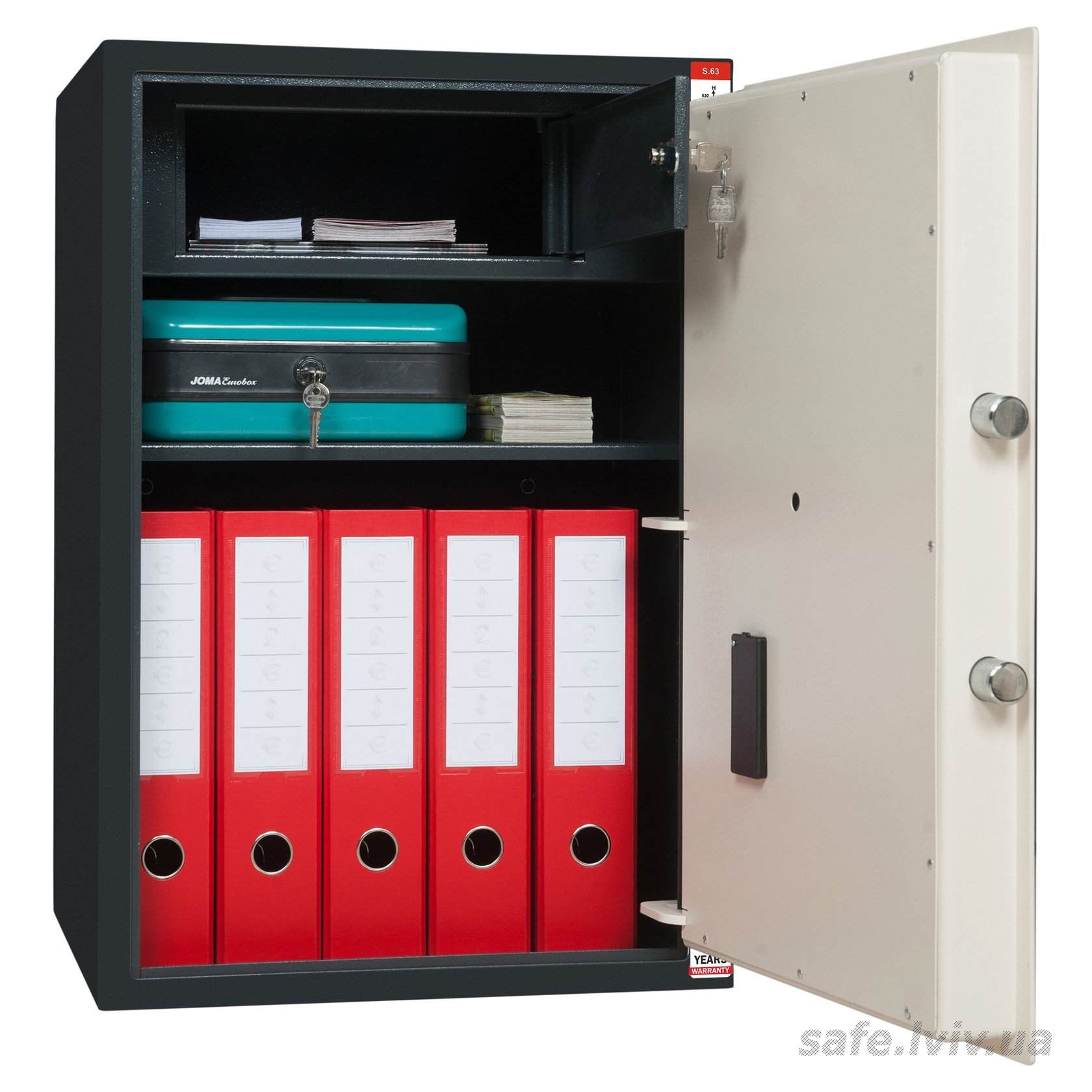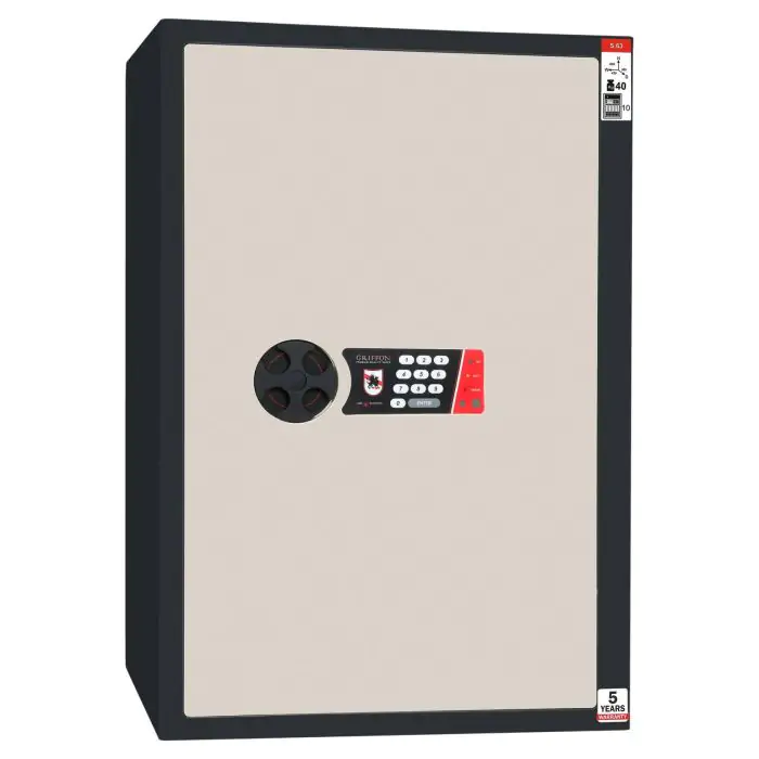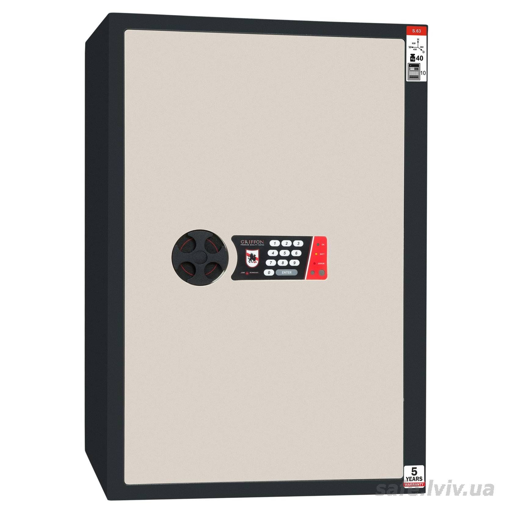 Griffon S.63.E це сейф офісний, для документів, призначений для надійного зберігання таких цінностей, як документи А4, ноутбук, папки А4 у квартирі чи установі. Конструкція корпусу 3 мм (сталь), дверей 3 мм (сталь), ригельна система одностороння, 2 ригелі Ø 25 мм. Доступні виконання замка - електронний Griffon 2.0 (Україна).