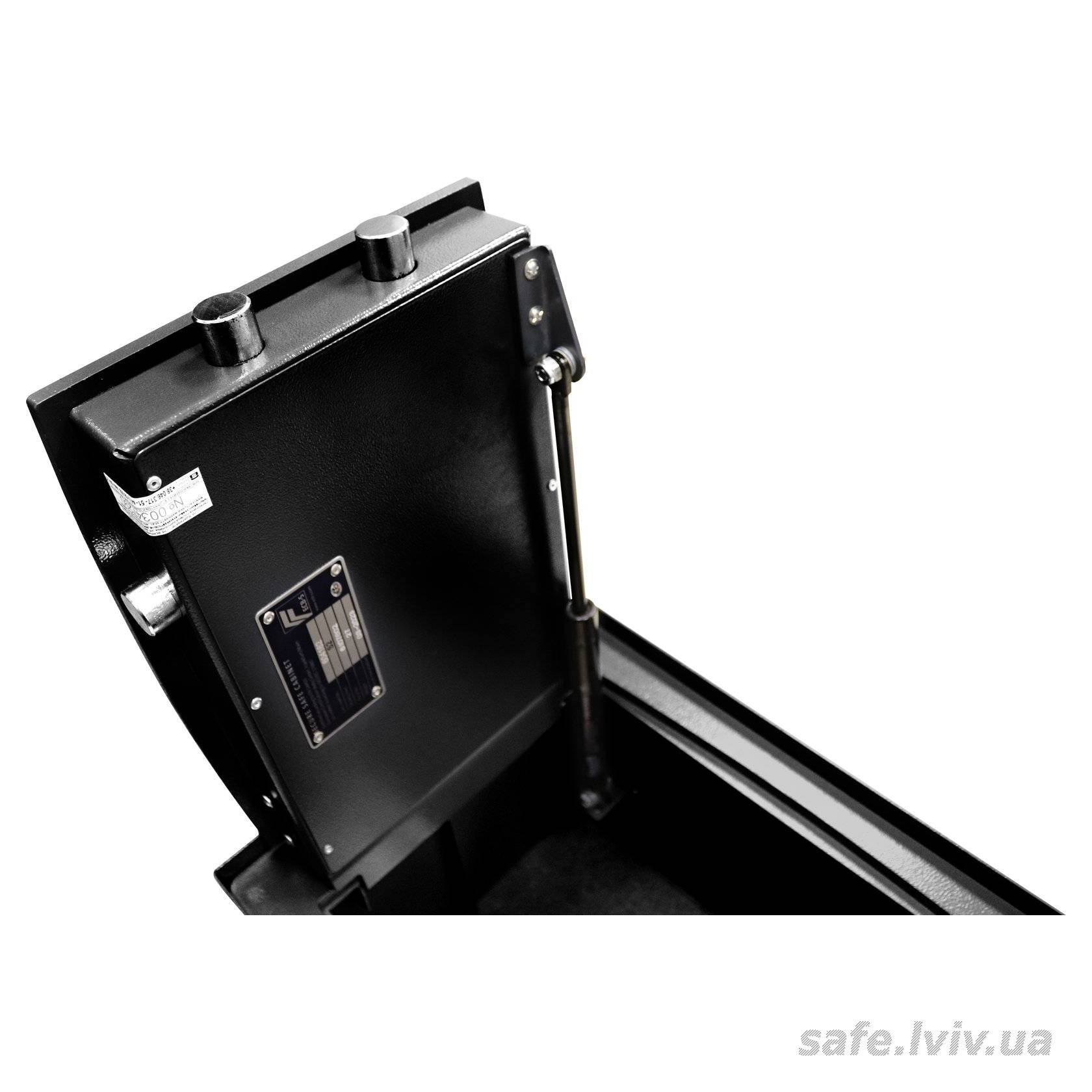 - Конструкція: корпус 2 мм (сталь), двері 10 мм (сталь); ригельна система тристороння, 4 ригелі Ø 25 мм.