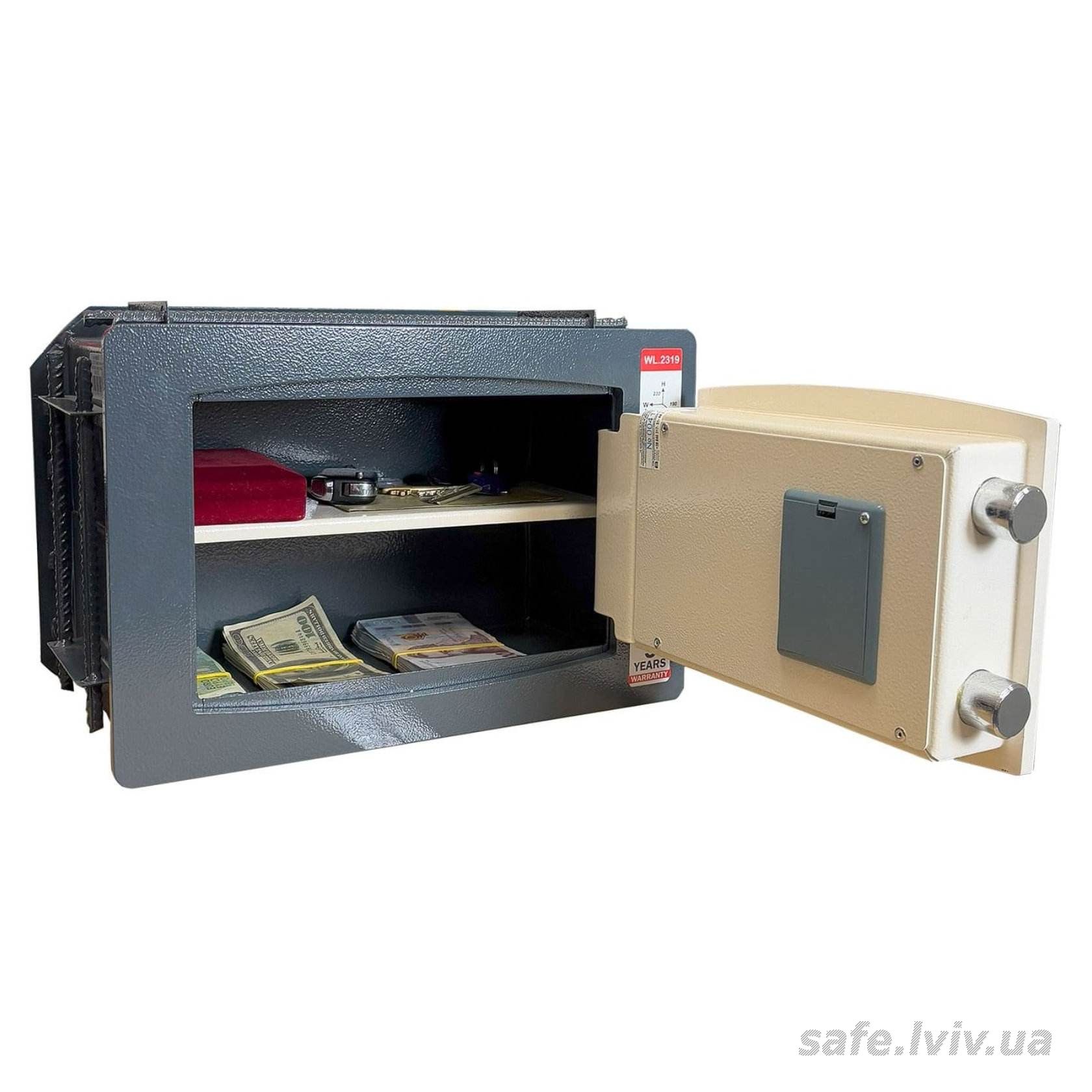 Griffon WL.2319.E це бюджетний сейф стінний, сейф вбудовуваний, призначений для захисту документів і невеликих сум грошей. Базовий рівень захисту забезпечують конструкція корпусу 2 мм (сталь) і дверей 8 мм (сталь), ригельна система одностороння, 2 ригелі Ø 25 мм та замок - електронний Griffon 2.0 (Україна).