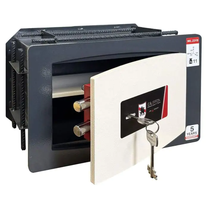 Griffon WL.2319.K це бюджетний сейф стінний, сейф вбудовуваний, призначений для захисту документів і невеликих сум грошей. Базовий рівень захисту забезпечують конструкція корпусу 2 мм (сталь) і дверей 8 мм (сталь), ригельна система одностороння, 2 ригелі Ø 16 мм та замок - ключовий SK 106/4 (Україна).