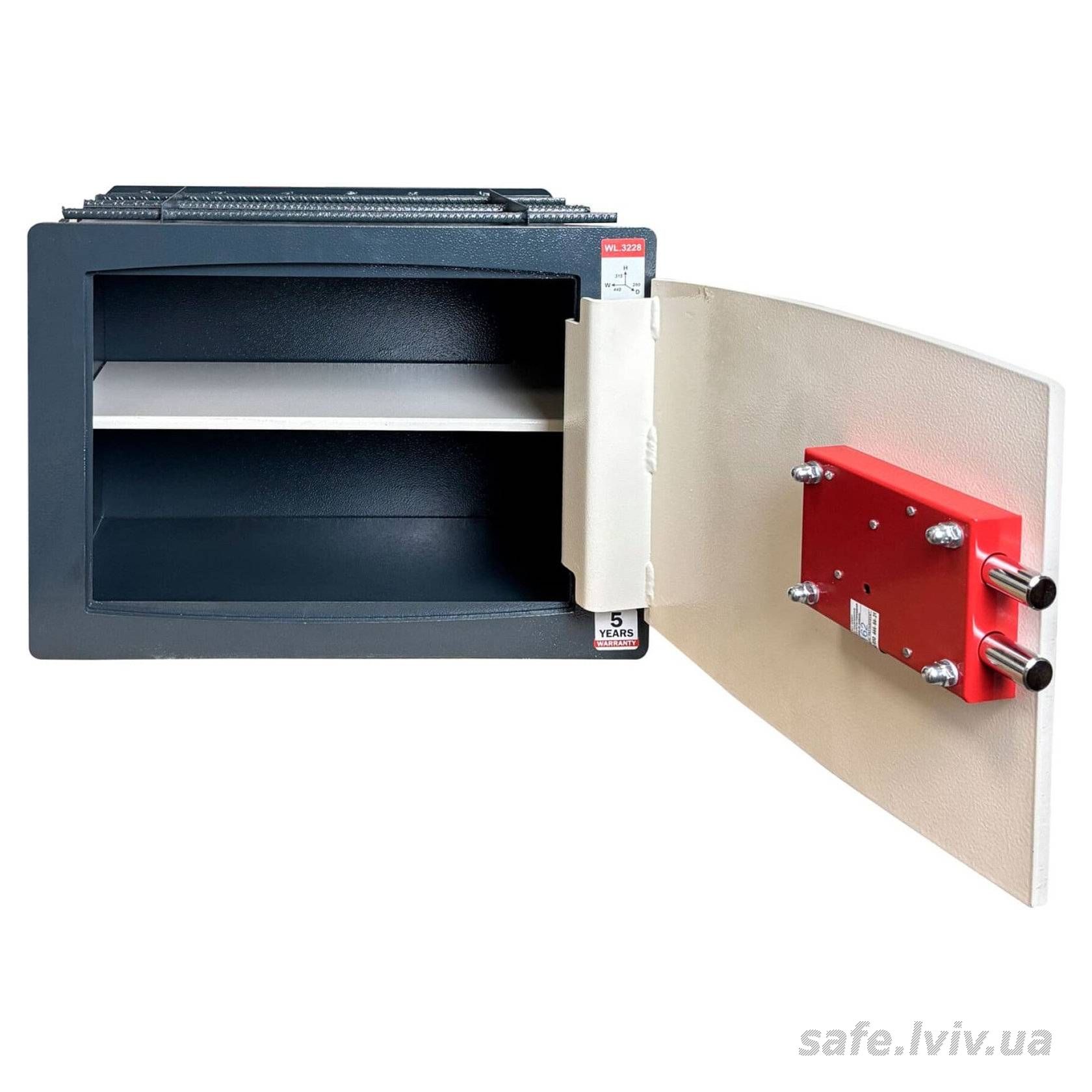 - Конструкція: корпус 2 мм (сталь), двері 8 мм (сталь); ригельна система одностороння, 2 ригелі Ø 16 мм.